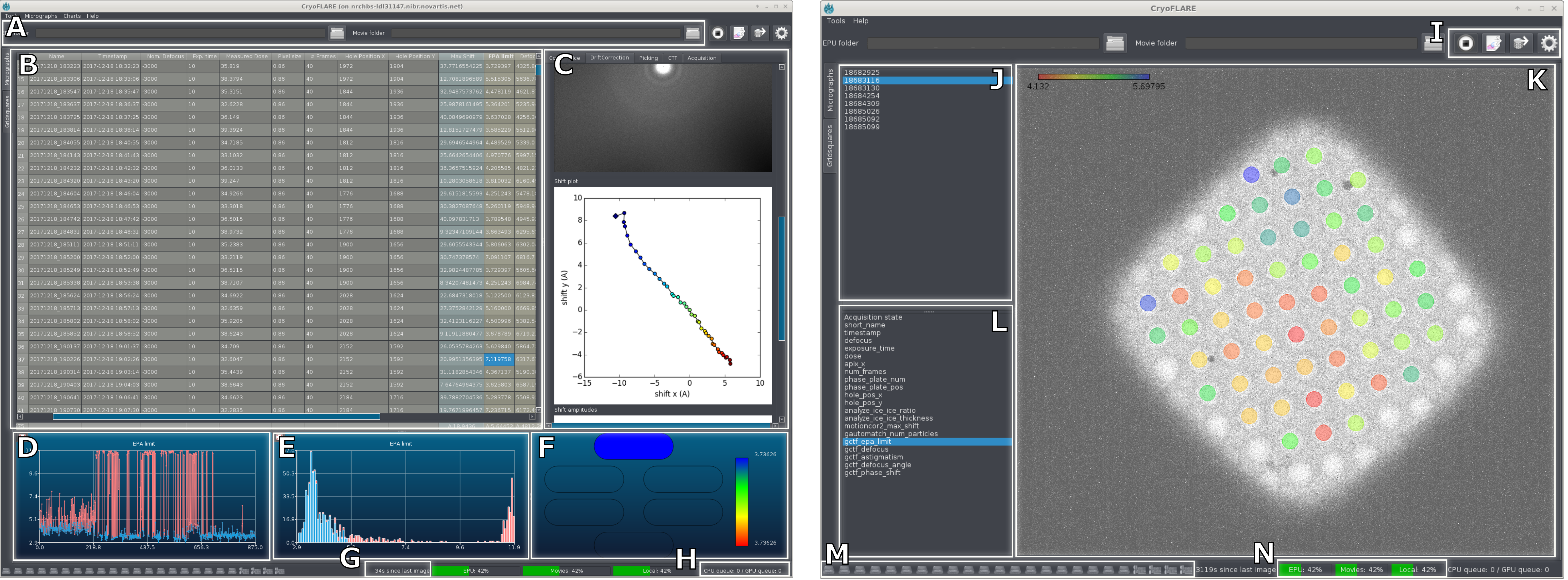 A) Project and movie folder selection. (B) List of micrographs displaying results from acquisition and processing. (C) Detail panel showing results from currently active micrograph as well as input form for user defined parameters. (D) Linear plot. (E) Histogram. (F) Phase plate heat plot. (G) Counter indicating time since last acquisition. (H) CPU and GPU queue (I) Buttons for export, reporting, start/stop and settings. (J) Grid square selection. (K) Grid square display with heat plot overlay. (L) Parameter selection for heat plot. (M) CPU and GPU activity display. (N) Disk usage display.